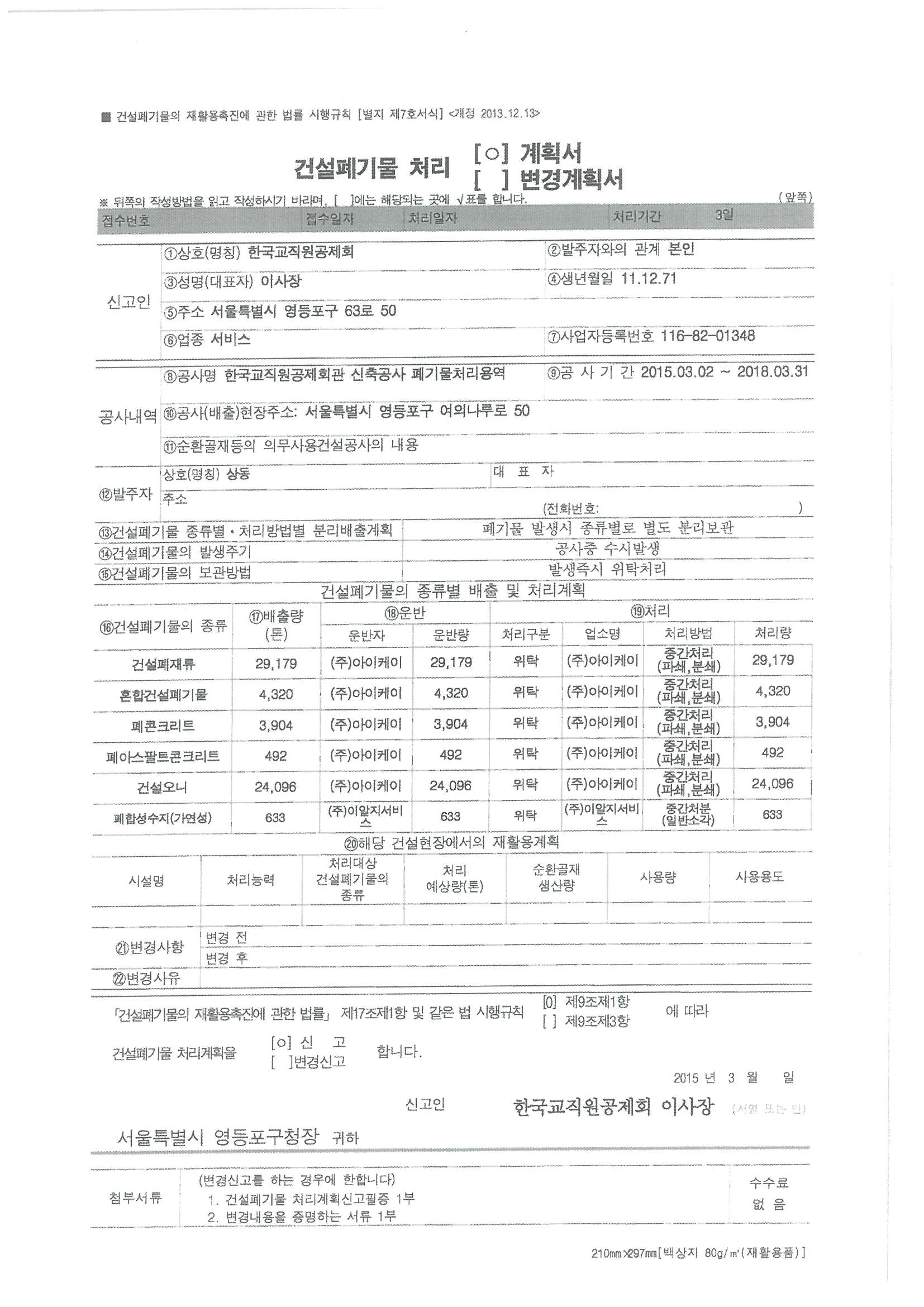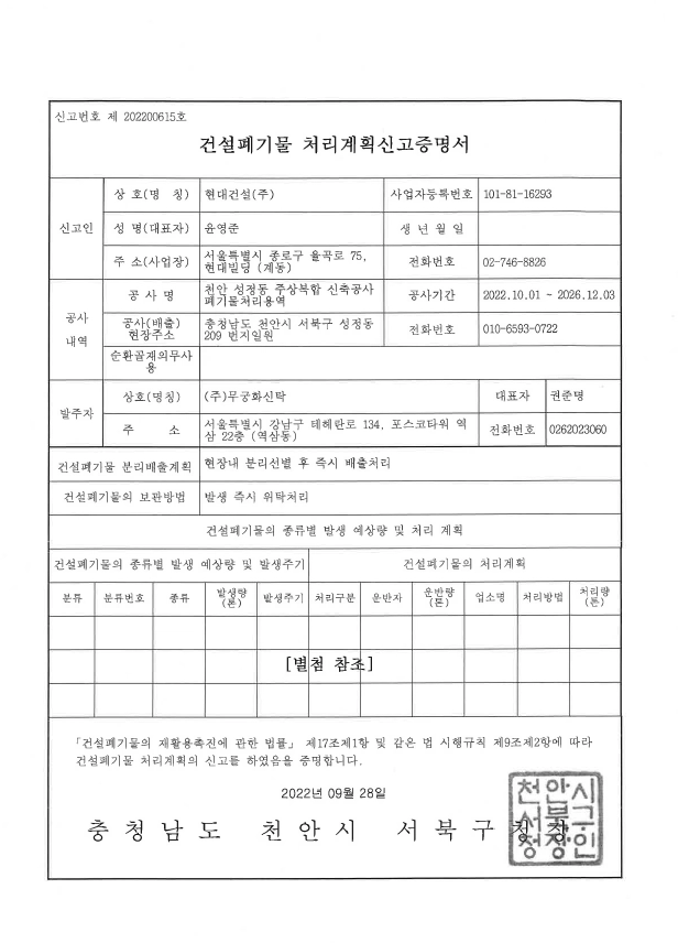 건설폐기물 처리계획서는 건설 현장에서 배출되는 폐기물 처리 신고에 대한 논의와 계획안을 작성하는 문서로 신고인, 상호, 사업자등록번호, 공사명, 발주자, 공사기간, 주소, 대표자, 건설폐기물의 종류, 배출량 등의 항목들로 구성이 되어 있다. 신고증명서는 이에 대한 신고를 하였음을 증명하기 위해 발급하는 문서이다.