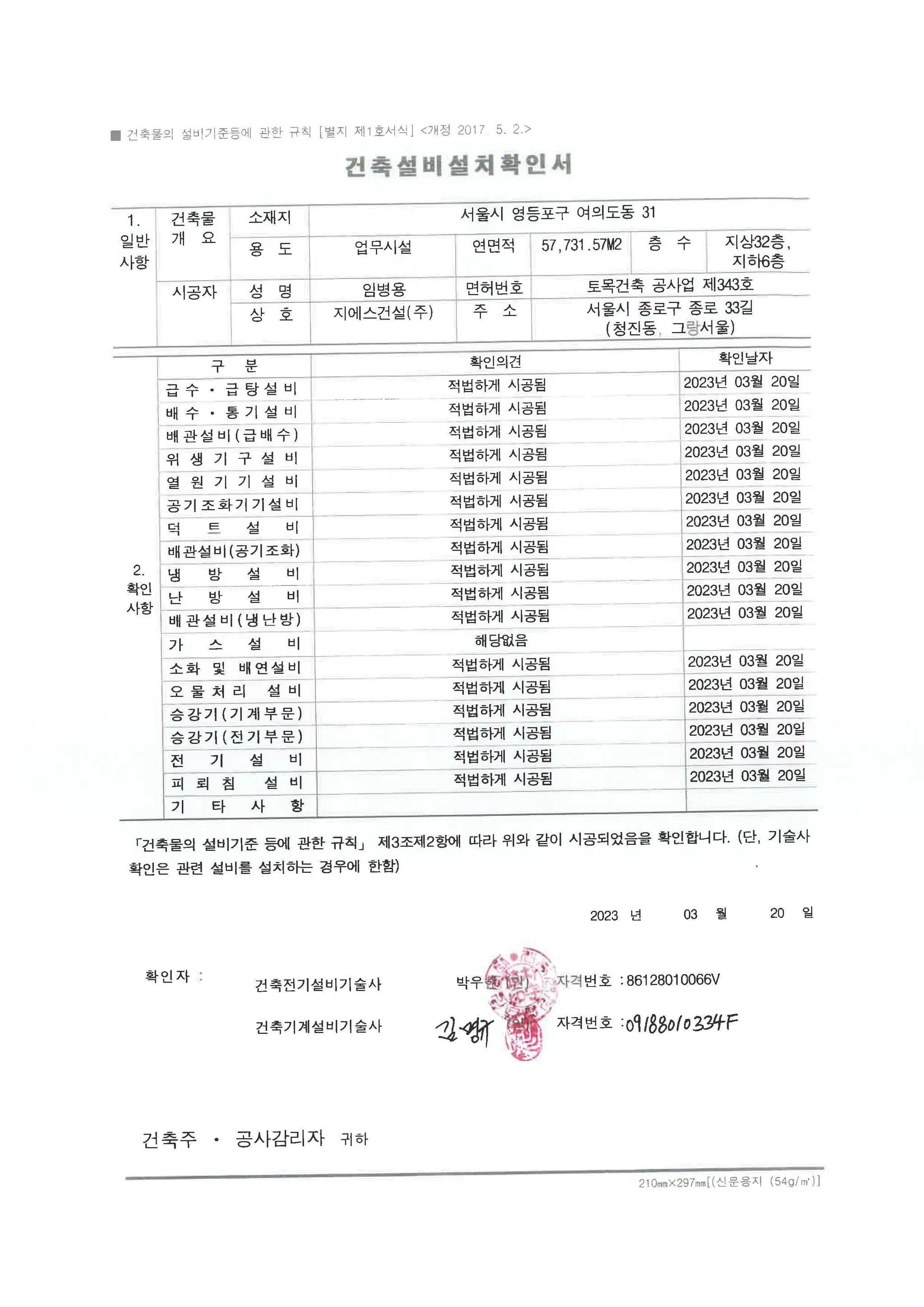 기계설비 분야 뿐만 아니라 전기설비 분야(승강기, 전기설비, 피뢰침 설비 등)도 해당되는 경우, 해당 기술사(건축전기설비기술사, 발송배전기술사, 건축기계설비기술사, 공조냉동기계기술사, 가스기술사 중) 기재 및 날인 필요